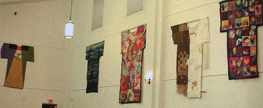 We started with Terry's sermon theme "New Clothes" and we talked about ways to help people relate to the need to purposefully "wear" these values in their lives, not just talk about them in church. These values get right down into the very fabric of our daily lives. We talked about how we might use various common clothing fabrics in creative ways. Eventually, we arrived at the idea to create ten "robes" that would be sewn or created from the fabrics donated by the congregation and put together by as many people who wanted to participate. We felt the community involvement itself — regardless of the appearance of the resulting robe — would demonstrate the value, and the congregation would feel more ownership both of the finished artwork, but of the core values themselves.