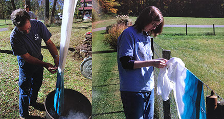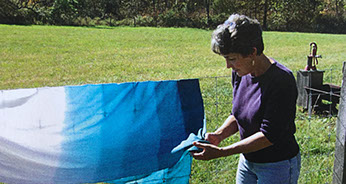 Also, the BIC don’t generally baptize infants. We stress believer’s baptism, so we don’t have the tradition of the baby’s baptism gowns, or christening dresses some other church traditions have. So when Donna Bert agreed to work with me on this robe, we talked about a fine white linen garment. We also talked about dying the bottom half to give the appearance of being dipped into the blue water, and changed forever. Her expertise as a weaver, dyer and fiber artist were invaluable as we talked through the process of getting from the design sketch to the finished robe. We even made the dying of the fabric a community event by invited people to come help with the dying process, and shared a meal together afterwards.
