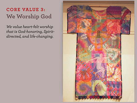 The artist’s statement that week said: “When reading the chapter on this core value I was struck with our connection to the worship happening throughout all of history around the throne of God in heaven. The cherubim and seraphim singing “Holy, Holy, Holy ...” Seeing God on His throne, and praising Him is central to our worship. The brilliant, dynamic colors evoke the energy, movement, and rhythm of our worship, and there’s also a deliberate mix of ancient tradition and modernity. Music is certainly part of our worship, and in this congregation we are also exploring the elements of dance and visual art. We want our worship to reflect the passion we have for God, as we treasure the beauty of His holiness.”